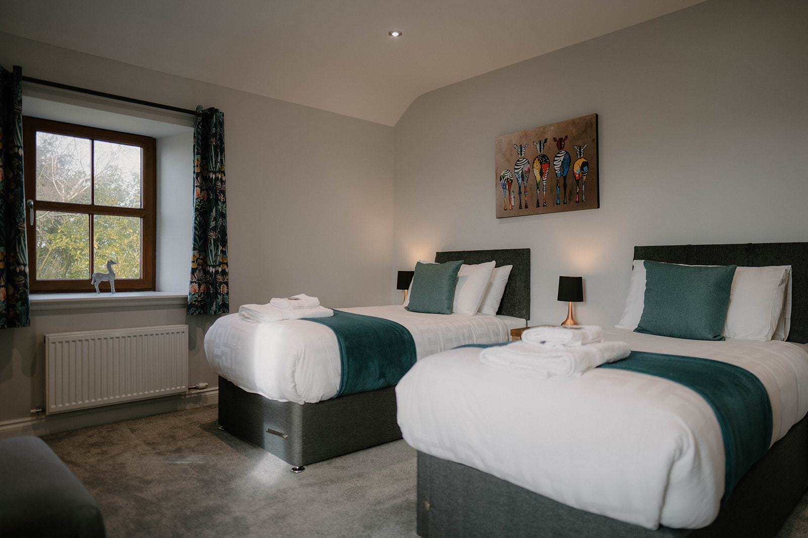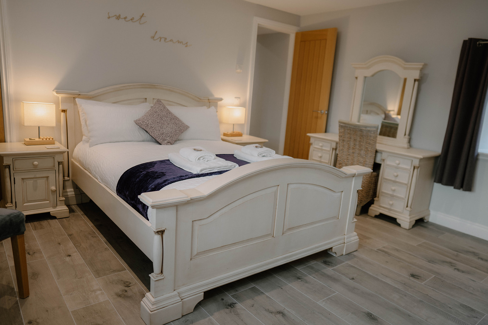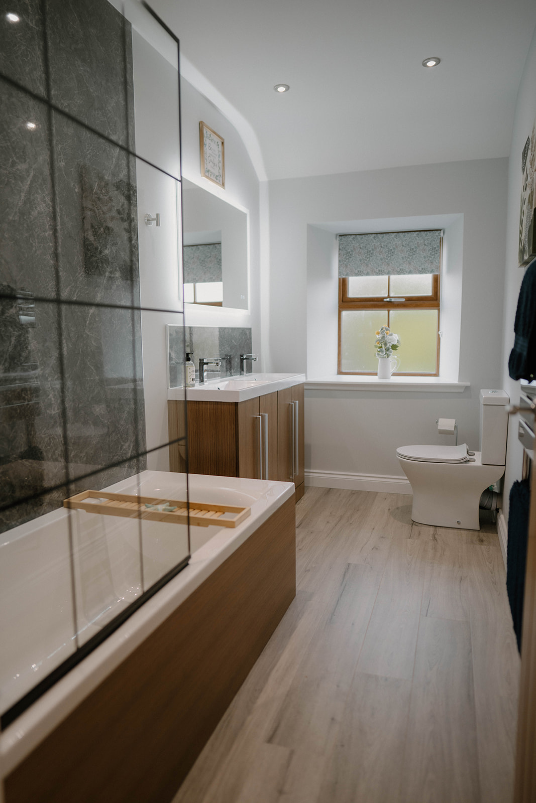 Upstairs, you'll find a luxurious master bedroom with king size bed overlooking the garden. The second bedroom upstairs has 2 single beds perfect for children or friends sharing (this room can be made up as a super king on request). The twin bedroom also has a Samsung smart TV which, if travelling with children, gives them a room to retreat to and provides both adults and children with their own space. Inbetween the 2 bedrooms you will find the main bathroom with double sink, LED/Bluetooth mirror, toilet, heated towel rail and over-bath shower. After a busy day, why not run a warm bubble bath and chose a new book from our collection and enjoy some time to yourself.